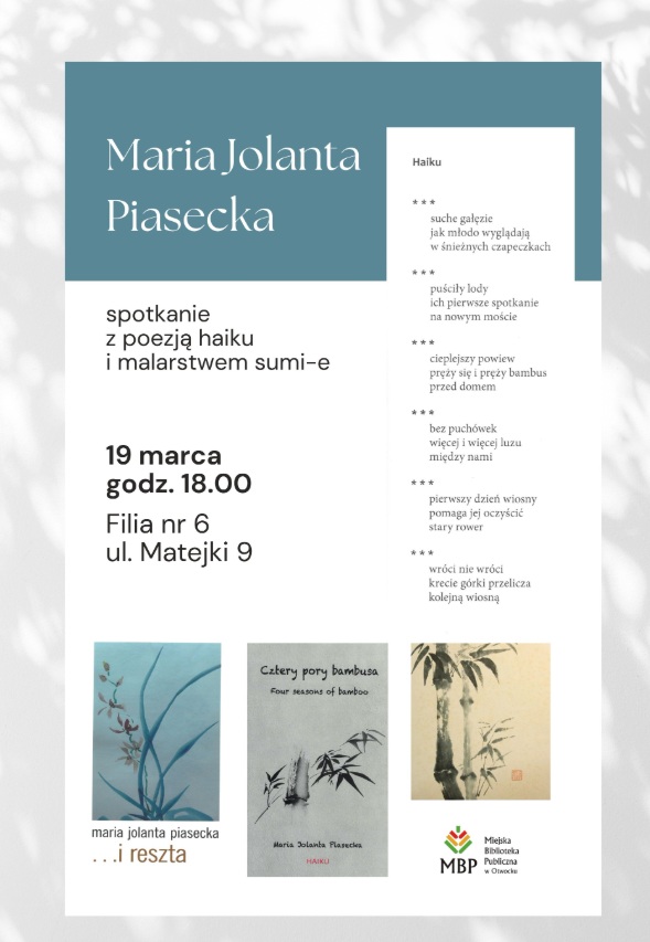 Miejska Biblioteka Publiczna w Otwocku ma przyjemność zaprosić wszystkich miłośników poezji haiku, malarstwa sumi, literatury i refleksji nad kulturą słowa na inspirujące spotkanie z Panią Marią Jolanta Piasecką 19 marca o godzinie 18:00 w Filii nr 6 ul. Matejki 9.