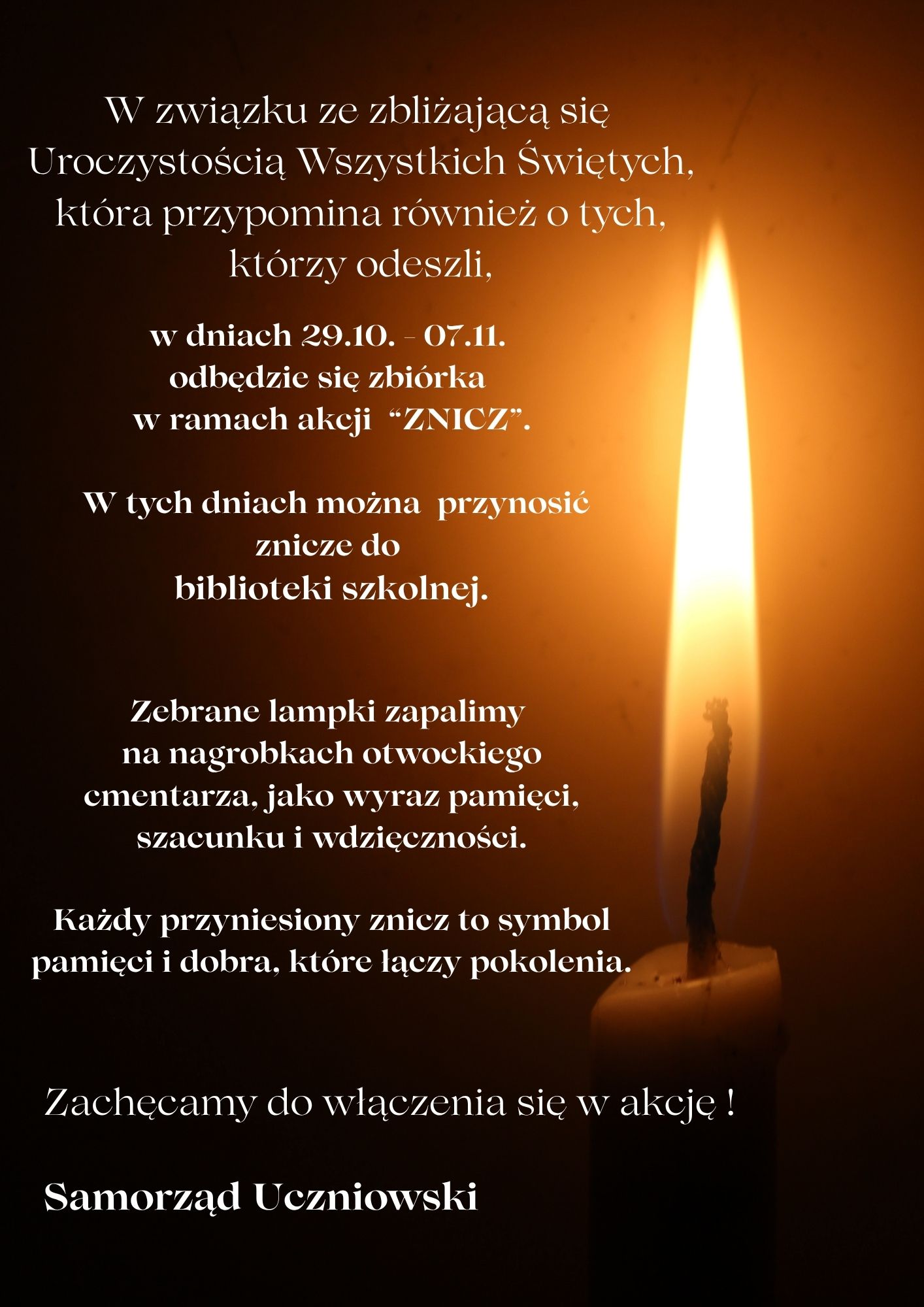 Droga Społeczności "Słowaka" w imieniu Samorządu Uczniowskiego zapraszamy do akcji, w której zbieramy znicze, by później zapalić je na otwockim cmentarzu w miejscach szczególnych, ale też i zapomnianych, jako wyraz pamięci, szacunku i wdzięczności za tych, którzy odeszli.