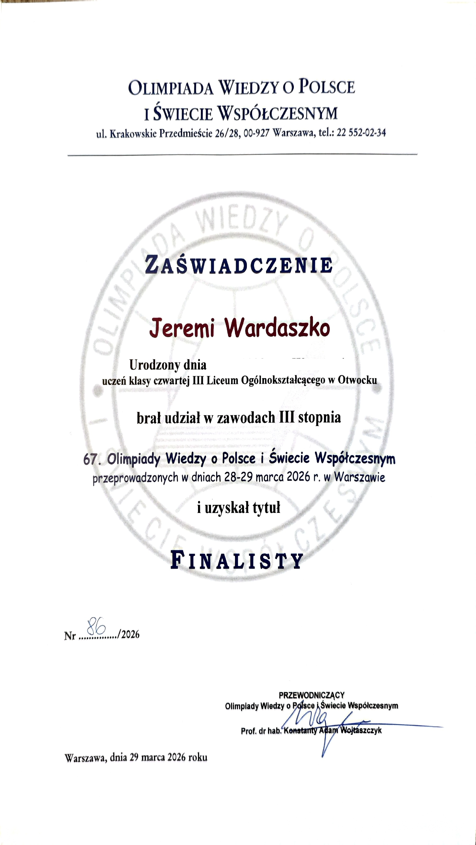 Z ogromną dumą informujemy, że uczeń klasy IVc2 naszego liceum, Jeremi Wardaszko, zdobył w tegorocznej edycji tytuł FINALISTY. Osiągnięcie to zwalnia go z obowiązku przystąpienia do egzaminu maturalnego z wiedzy o społeczeństwie, a jednocześnie gwarantuje uzyskanie maksymalnego wyniku – 100% z tego przedmiotu.