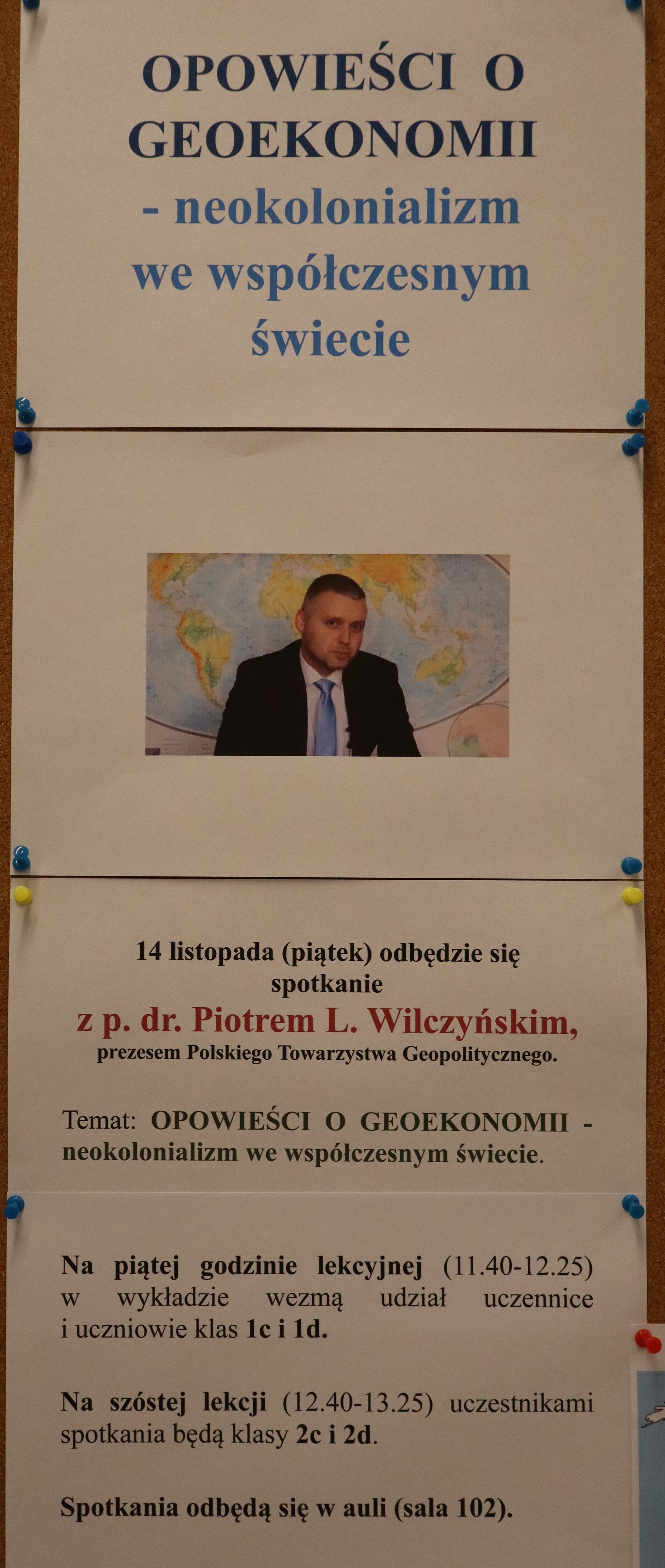 Uczniowie czterech klas (1c, 1d, 2c, 2d) mieli możliwość wysluchania prelekcji/wykladu na temat: OPOWIEŚCI O GEOEKONOMII - neokolonializm we współczesnym świecie. Pan doktor przedstawił to skomplikowane zagadnienie w tak niesamowicie interesującej formie, że po zakoczeniu prelekcji uczniowie domagali się kontynuacji tego spotkania i nie chcielki wyjść na przerwę.