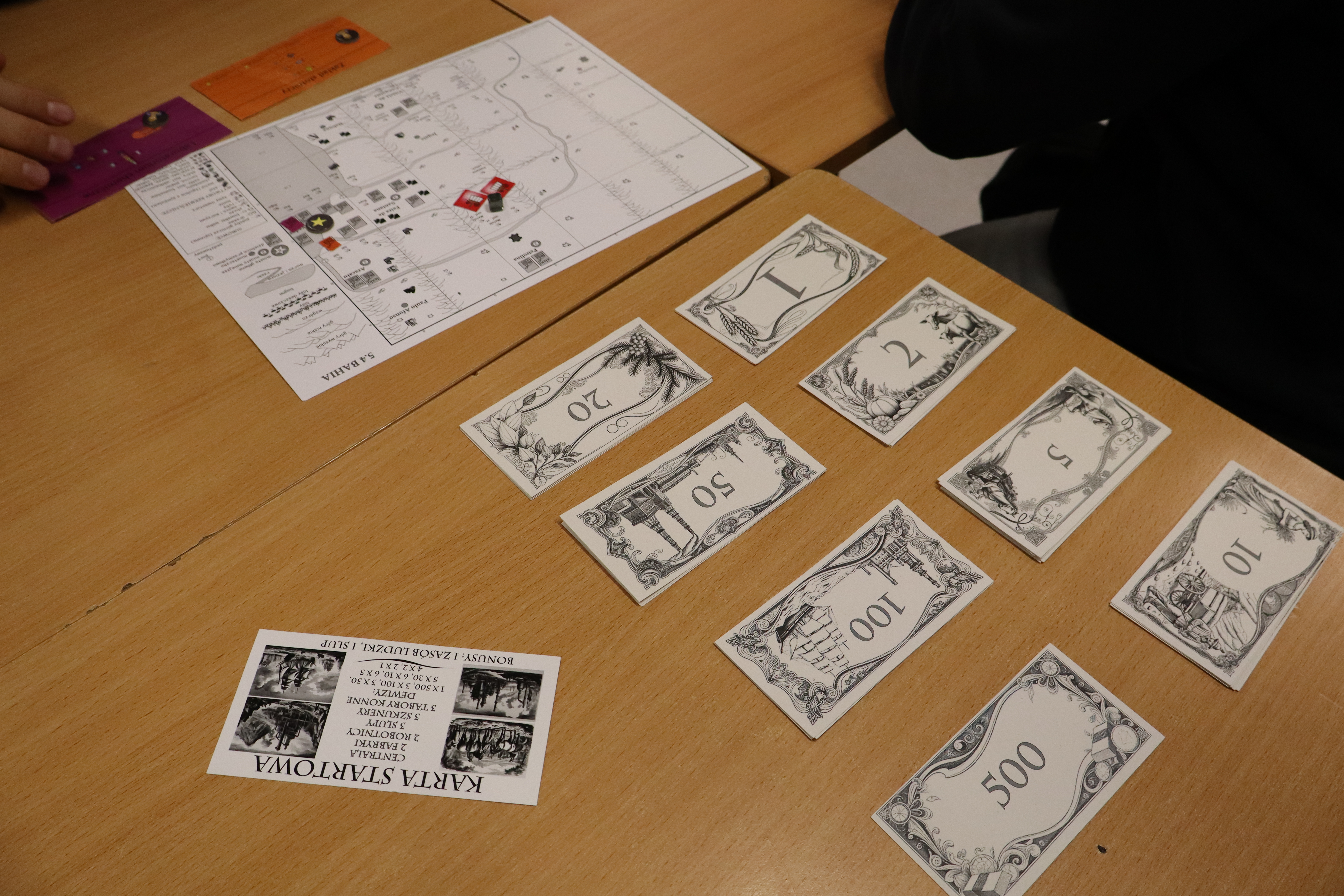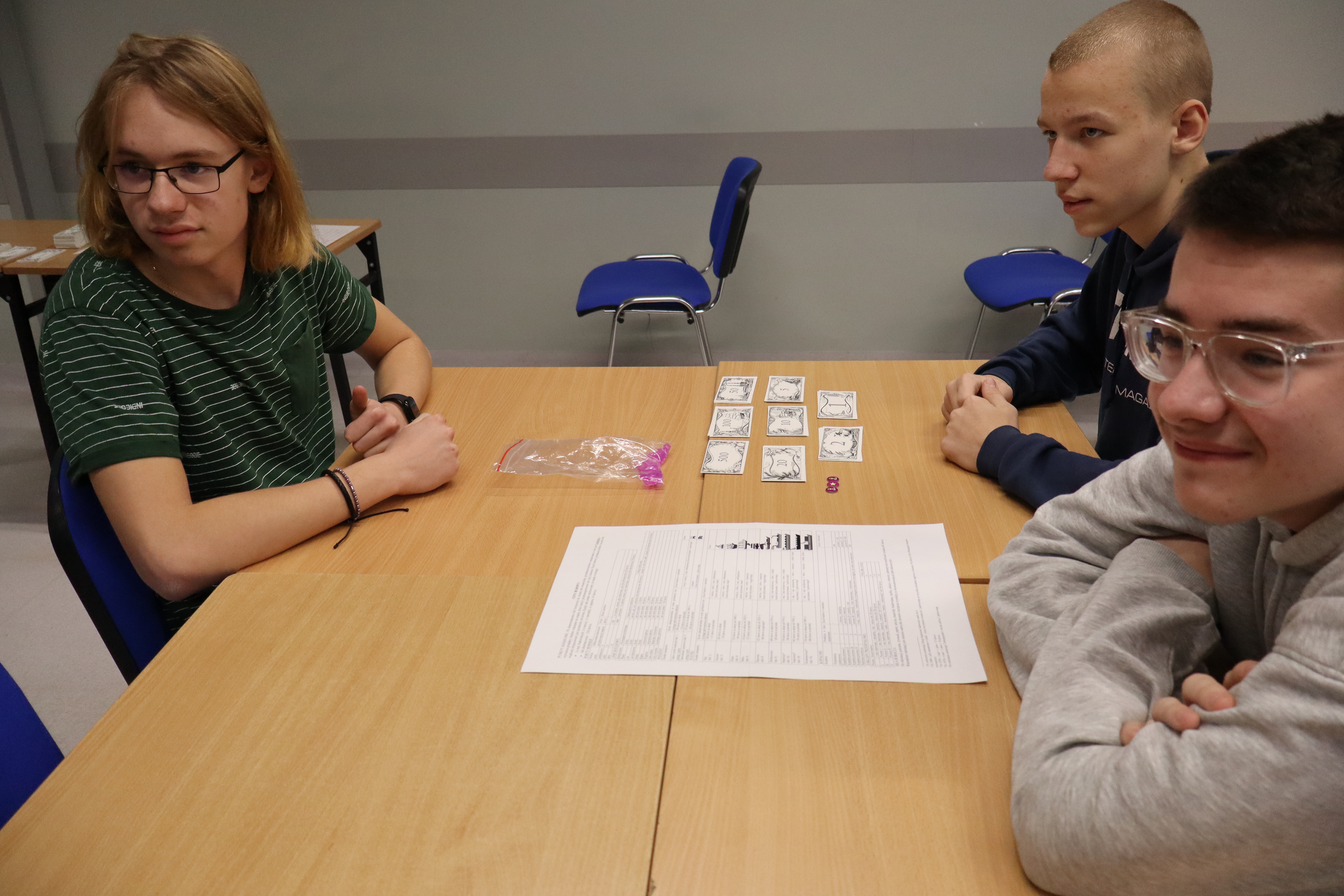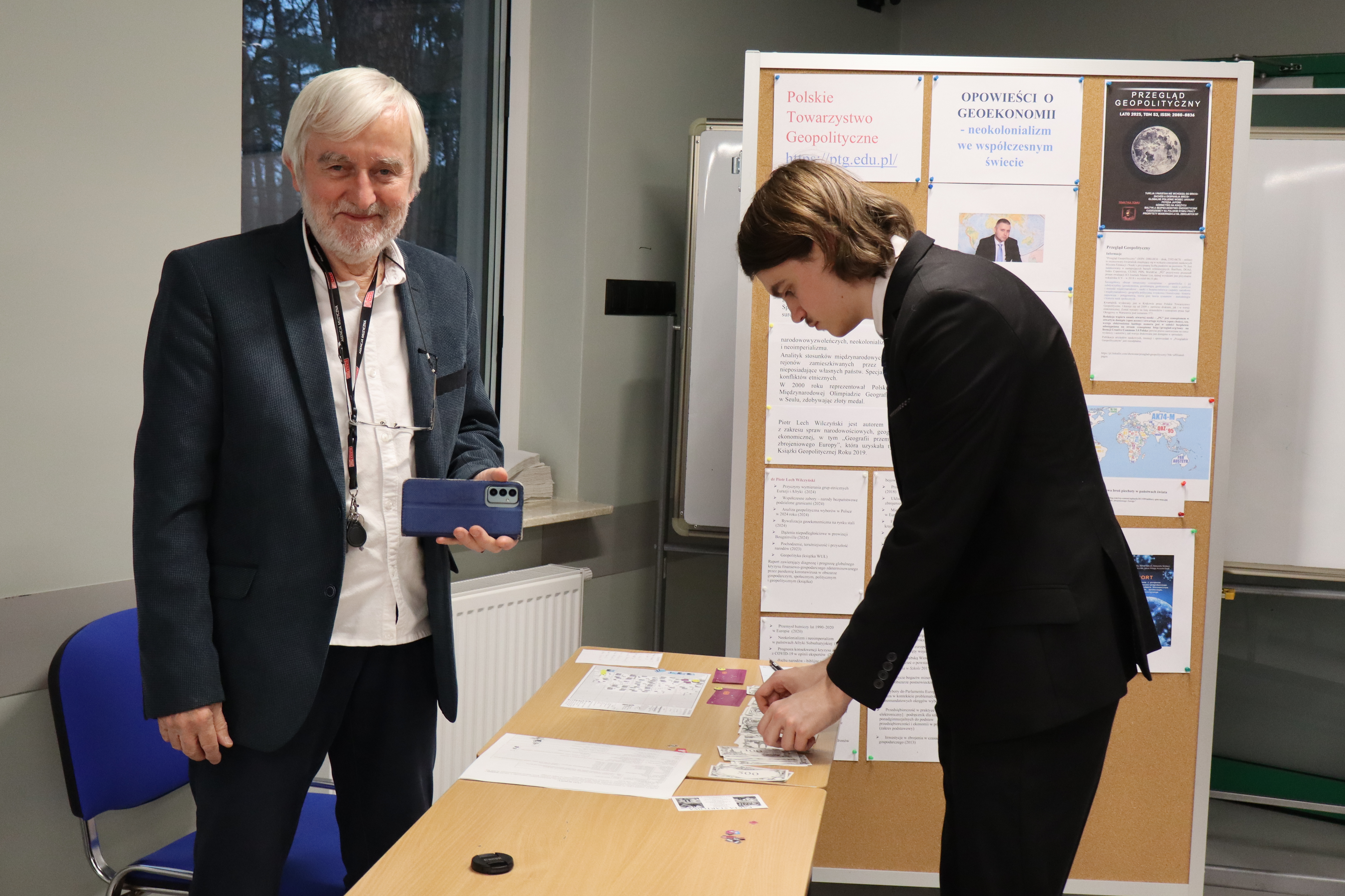 Część druga tego wydarzenia przeznaczona była dla niewielkiej grupy chętnych uczniów, którzy chcieli zostać po prelekcji na ok 5 godzin, w celu przeprowadzenia gry dydaktycznej GEOEKONOMIA. Na tych warsztatach zostało dziewięcioro uczniów, którym trzyosobowa grupa pracowników PTG wyjaśniła zasady mechaniki rozgrywki. Uczniowie i towarzyszący im nauczyciele nauczyli się korzystać z tej gry, która ma charakter dydaktyczny i uczy geoekonomii oraz historii gospodarczej XIX i XX wieku. Trzy grupy uczniow dzielnie pracowały w swoich zespołach przez kilka godzin. Efekty ich działań były imponujące.