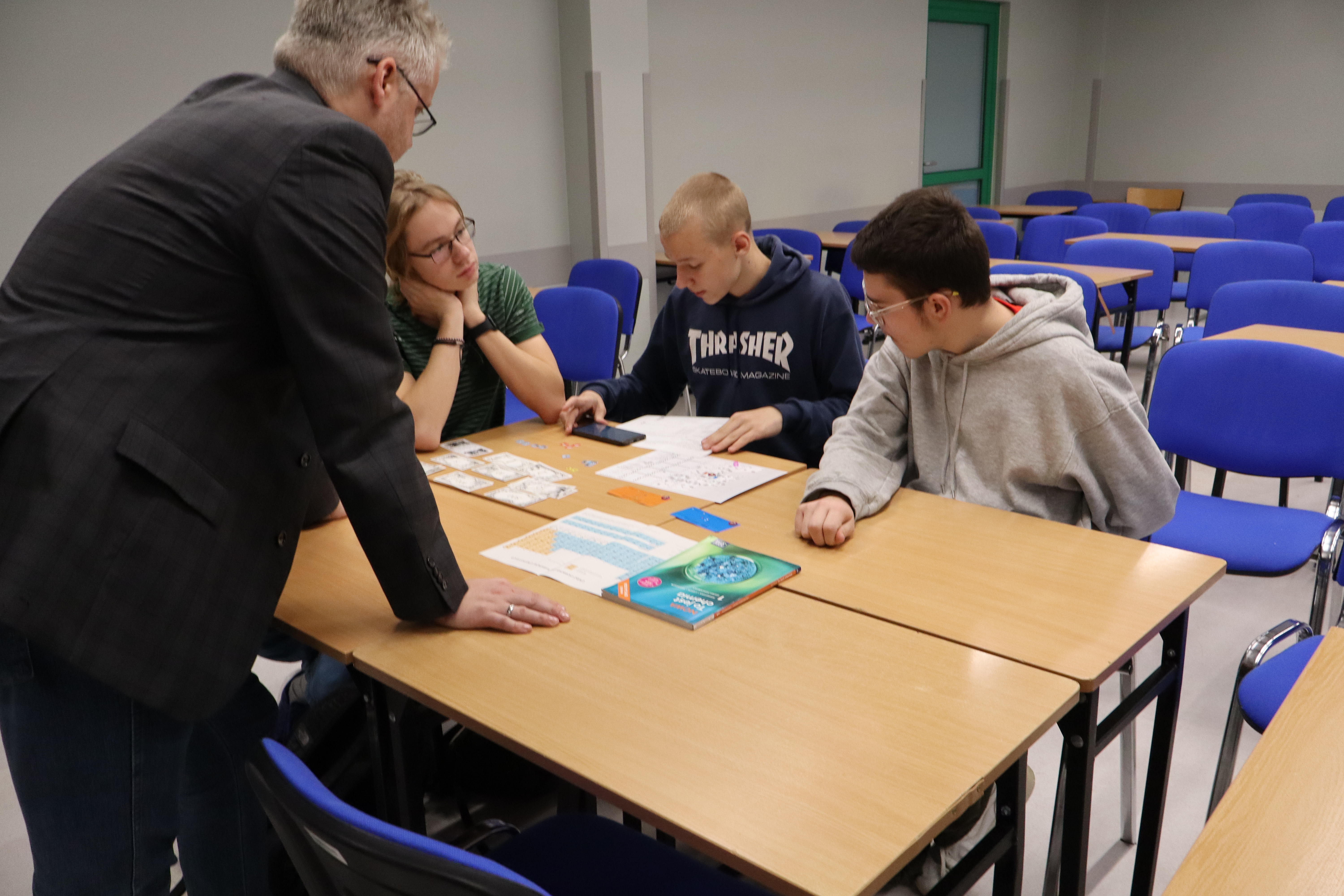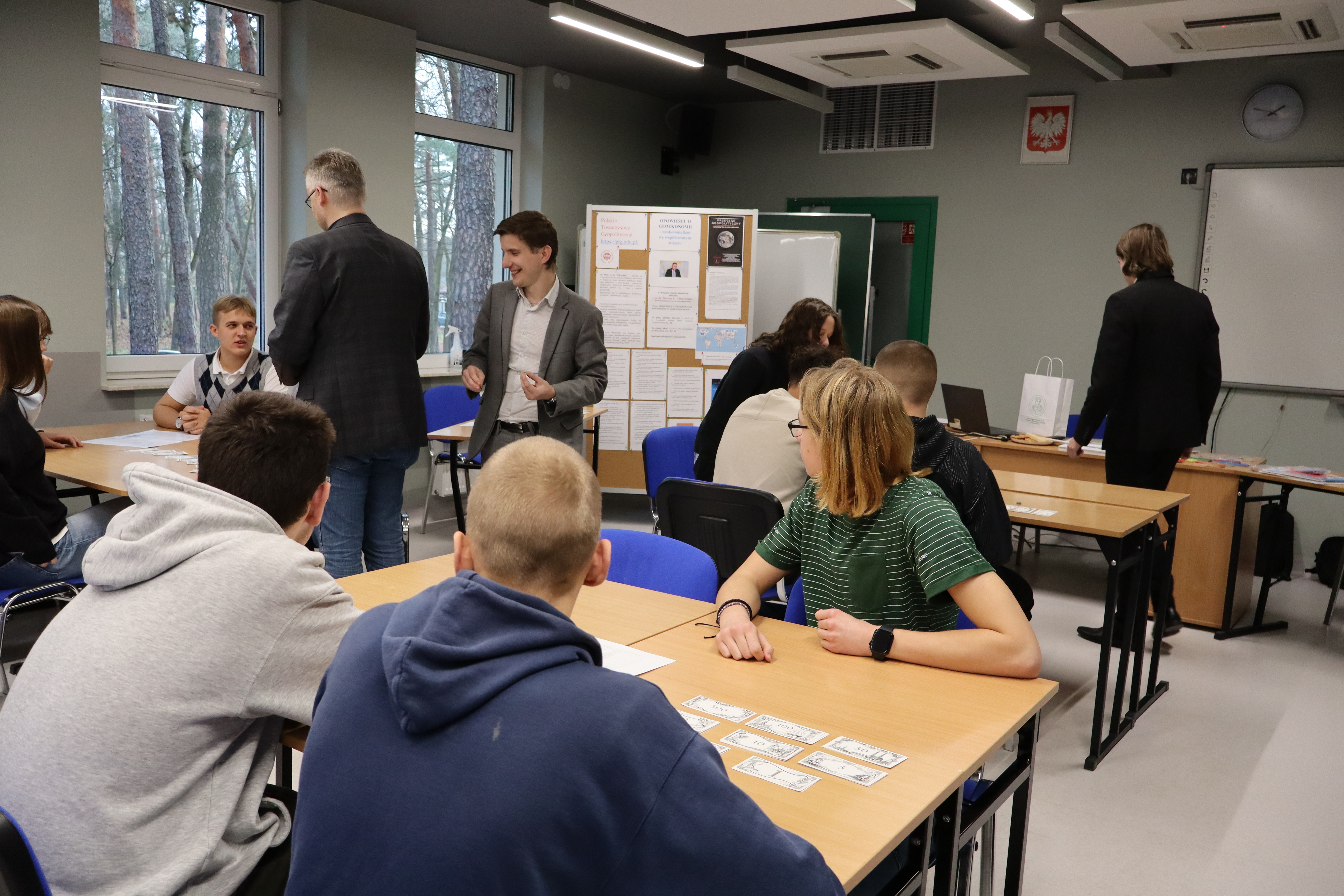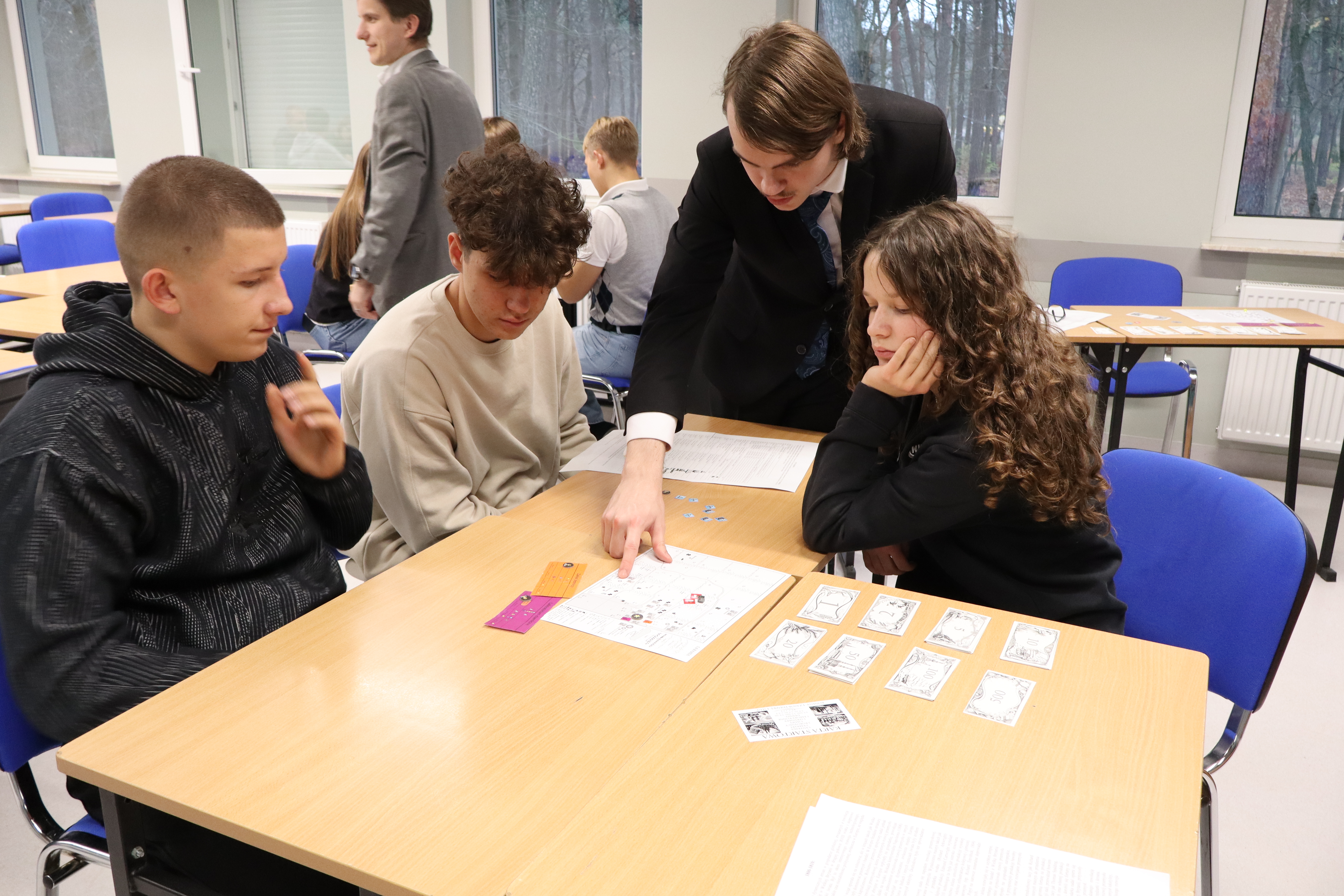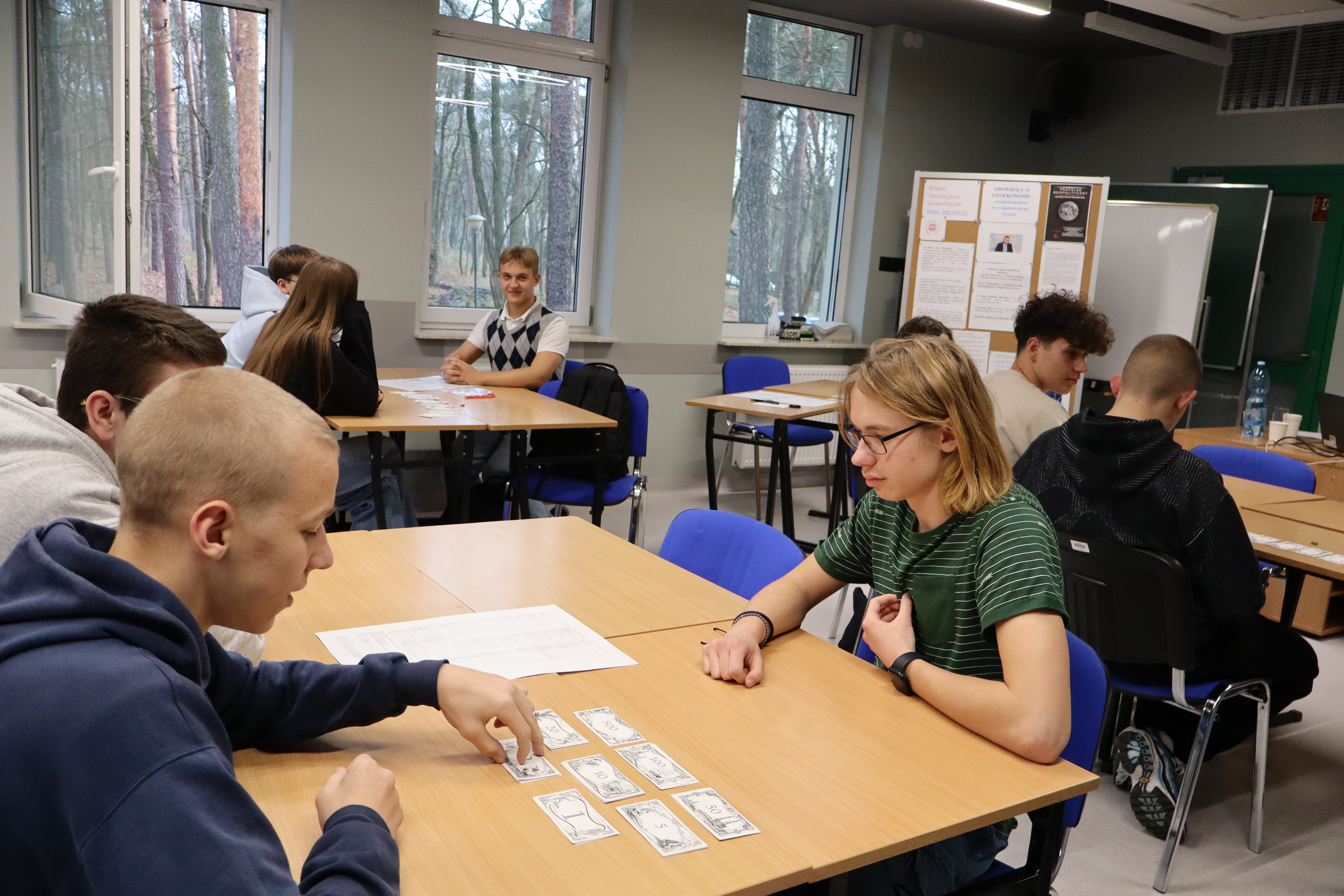 Część druga tego wydarzenia przeznaczona była dla niewielkiej grupy chętnych uczniów, którzy chcieli zostać po prelekcji na ok 5 godzin, w celu przeprowadzenia gry dydaktycznej GEOEKONOMIA. Na tych warsztatach zostało dziewięcioro uczniów, którym trzyosobowa grupa pracowników PTG wyjaśniła zasady mechaniki rozgrywki. Uczniowie i towarzyszący im nauczyciele nauczyli się korzystać z tej gry, która ma charakter dydaktyczny i uczy geoekonomii oraz historii gospodarczej XIX i XX wieku. Trzy grupy uczniow dzielnie pracowały w swoich zespołach przez kilka godzin. Efekty ich działań były imponujące.