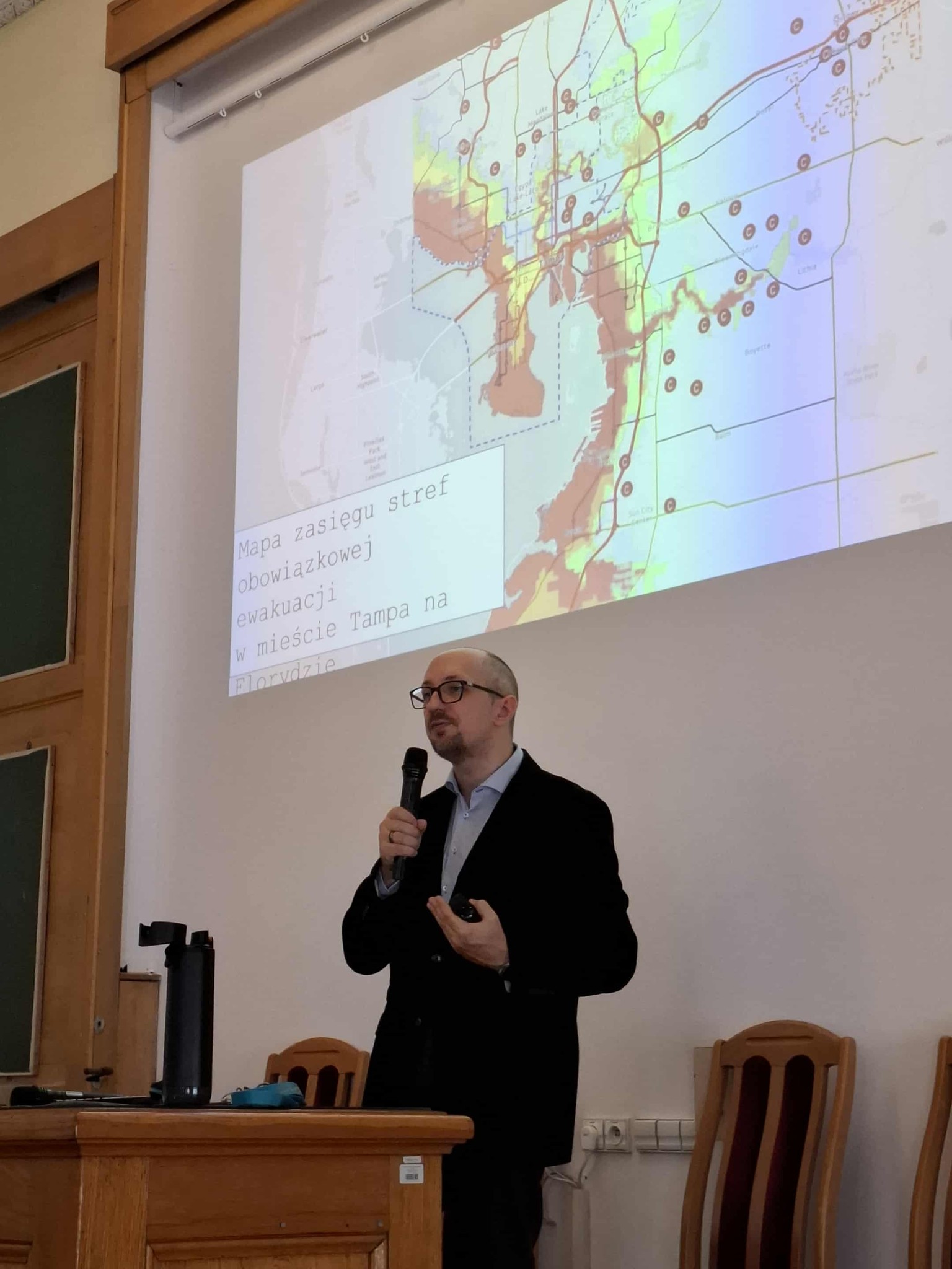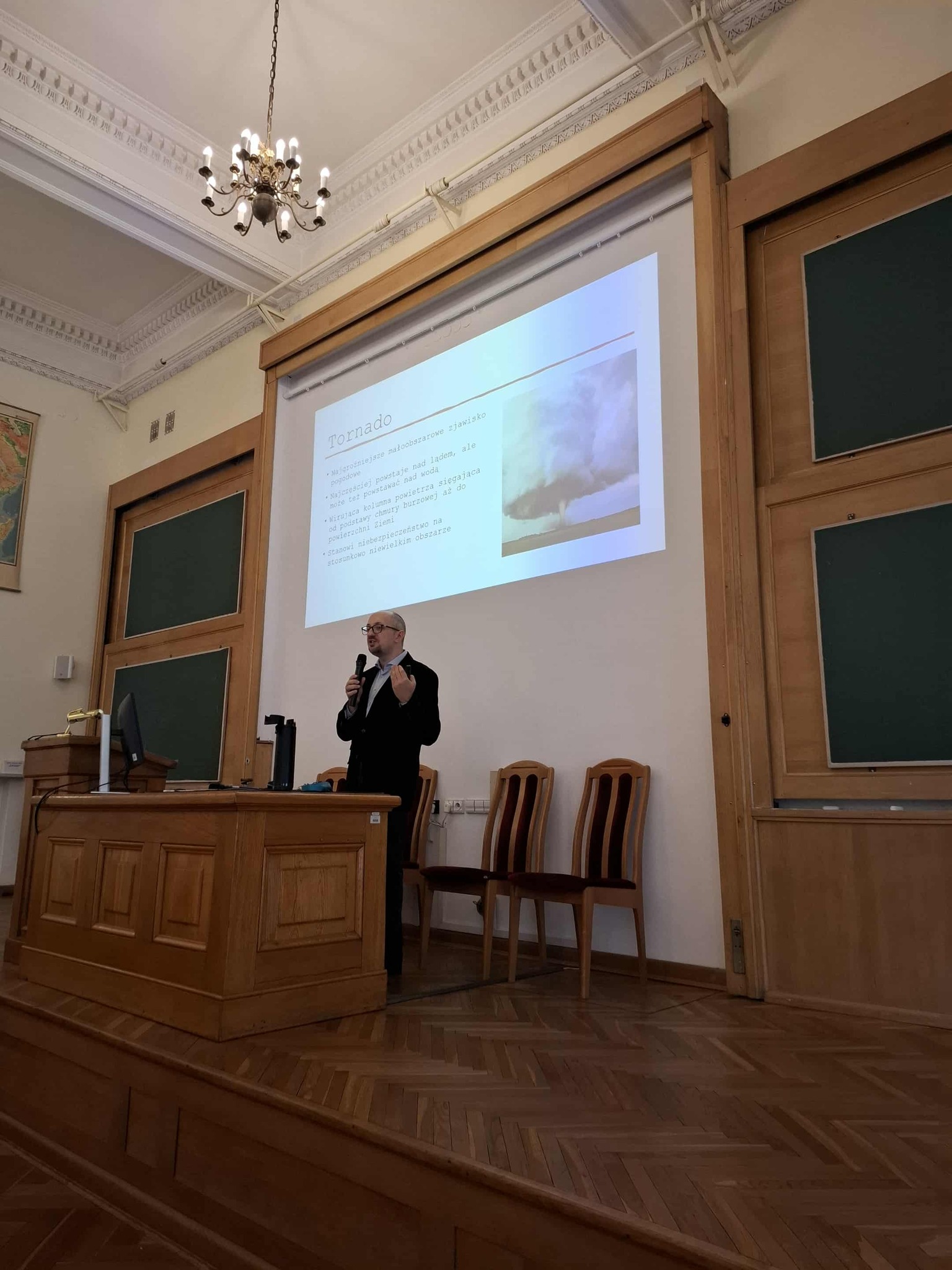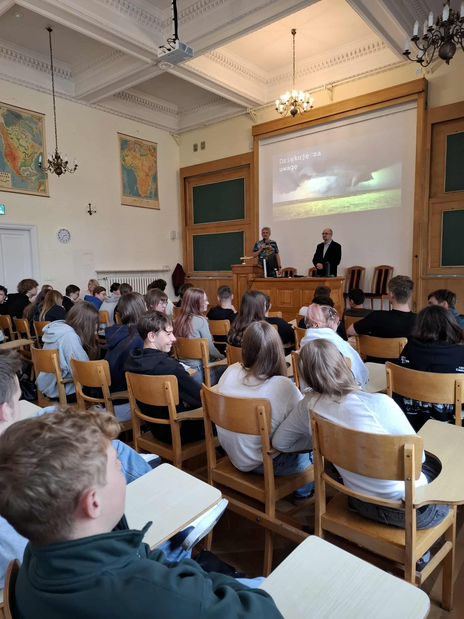 Te i wiele innych informacji na temat ekstremalnych zjawisk w atmosferze usłyszeli uczniowie klasy 3d w czasie wykładu dr. Kamila Leziaka pt „Od tornad do huraganów: niebezpieczne zjawiska związane z silnym wiatrem” wygłoszonego w ramach „Geograficznych Spotkań na Krakowskim”. To cykl spotkań przygotowanych dla uczniów szkół średnich przez pracowników Wydziału Geografii i Studiów Regionalnych na Uniwersytecie Warszawskim mający na celu zainteresowanie słuchaczy otaczającym światem i poszerzanie wiedzy geograficznej.