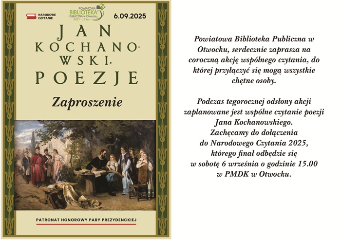 Narodowe Czytanie zostało zainicjowane w 2012 roku lekturą Pana Tadeusza Adama Mickiewicza. Jest to akcja, której celem jest promocja czytelnictwa jako podstawowej formy obcowania z kulturą. Dzieje się to poprzez wspólne czytanie wybitnych dzieł polskiej literatury, co umacnia więzi kulturowe i narodowe. W tym roku Narodowe Czytanie poświęcone było poezji Jana Kochanowskiego, najwybitniejszego poety polskiego renesansu. Jego dzieła, charakteryzujące się pięknem języka i uniwersalną tematyką, poruszają ponadczasowe kwestie, takie jak zaduma nad światem czy troska o Polskę.