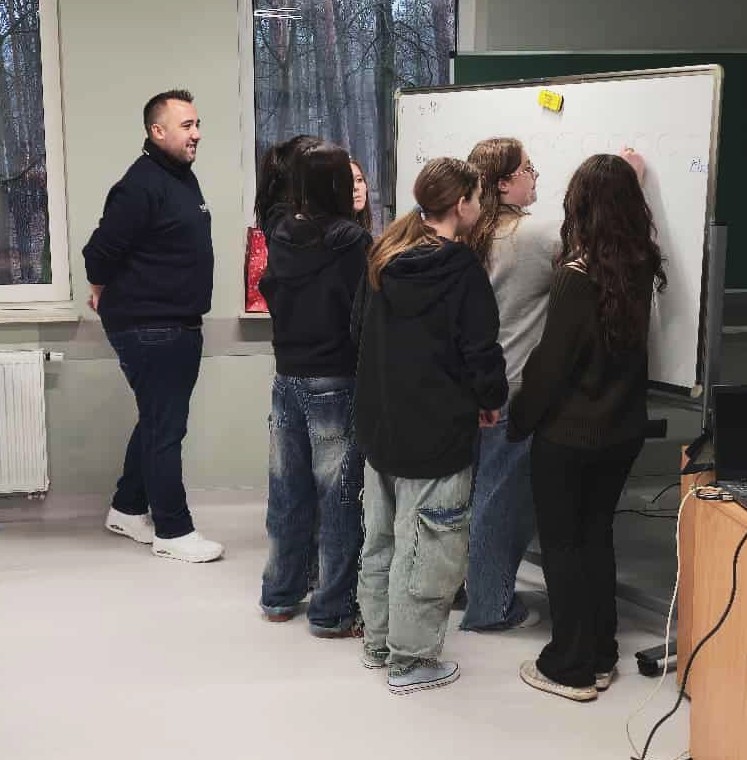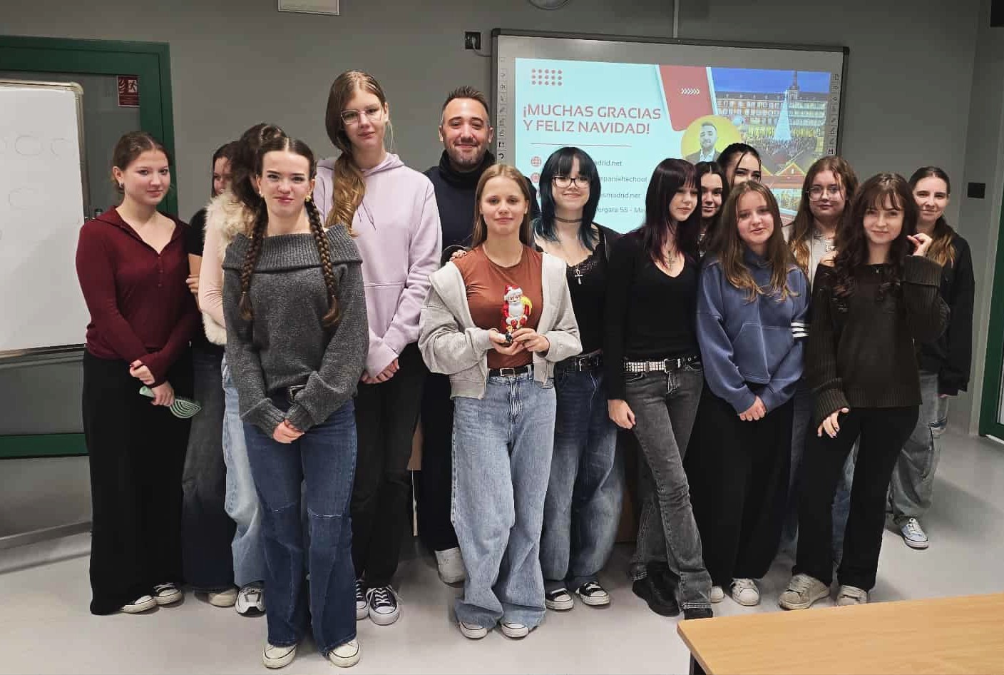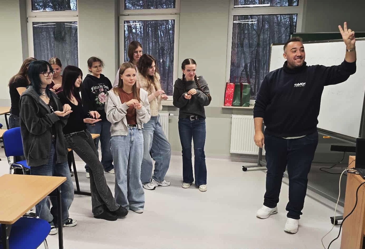 Spotkanie szybko zamieniło się w pełne śmiechu warsztaty – młodzież rywalizowała w krótkich dialogach, ćwiczeniach słownictwa i dynamicznych grach ruchowych, które zachęcały do swobodnego używania języka hiszpańskiego. Goście nie tylko uczyli, ale też opowiadali o swojej kulturze, dzięki czemu atmosfera była niezwykle otwarta i inspirująca. Uczniowie zgodnie podkreślali, że taka forma nauki pozwala przełamać bariery i dodać odwagi w mówieniu po hiszpańsku.