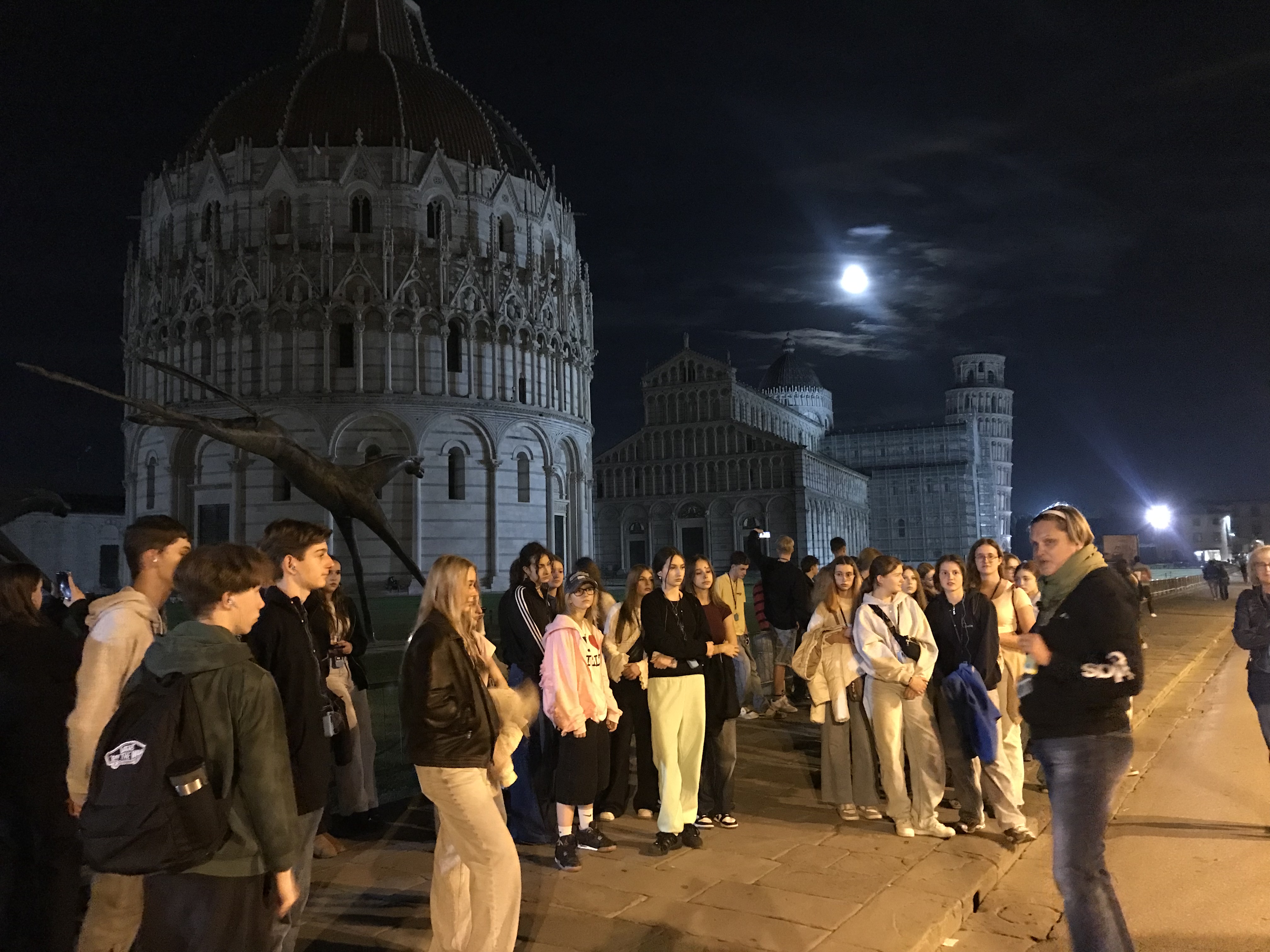 Na obiad pojechaliśmy na pyszny obiad, przed którym pani opowiadała nam produkcji wina oraz oliwy. Następnie klasą udaliśmy się do Pizy, aby zobaczyć słynną Krzywą Wieżę. Widok na plac i całą katedrę był niesamowity, szczególnie księżyc, ponieważ byliśmy tam wieczorem, a zdjęcia z podtrzymywaniem wieży wyszły świetnie."