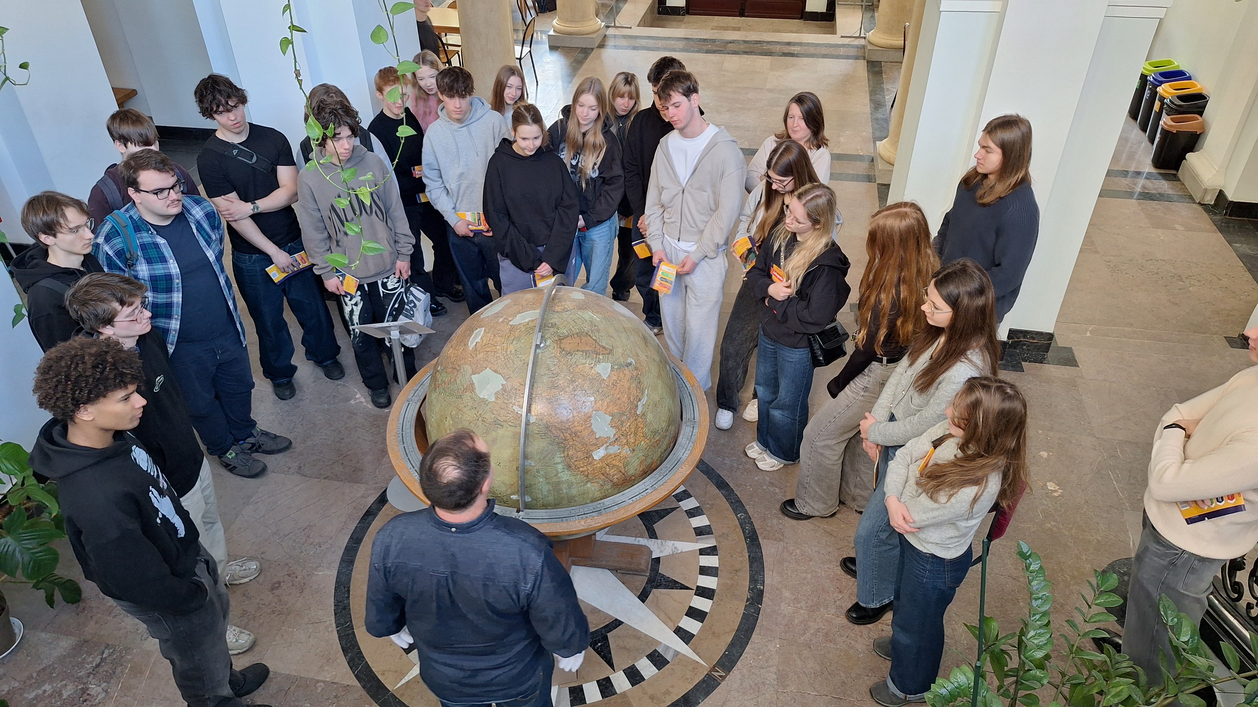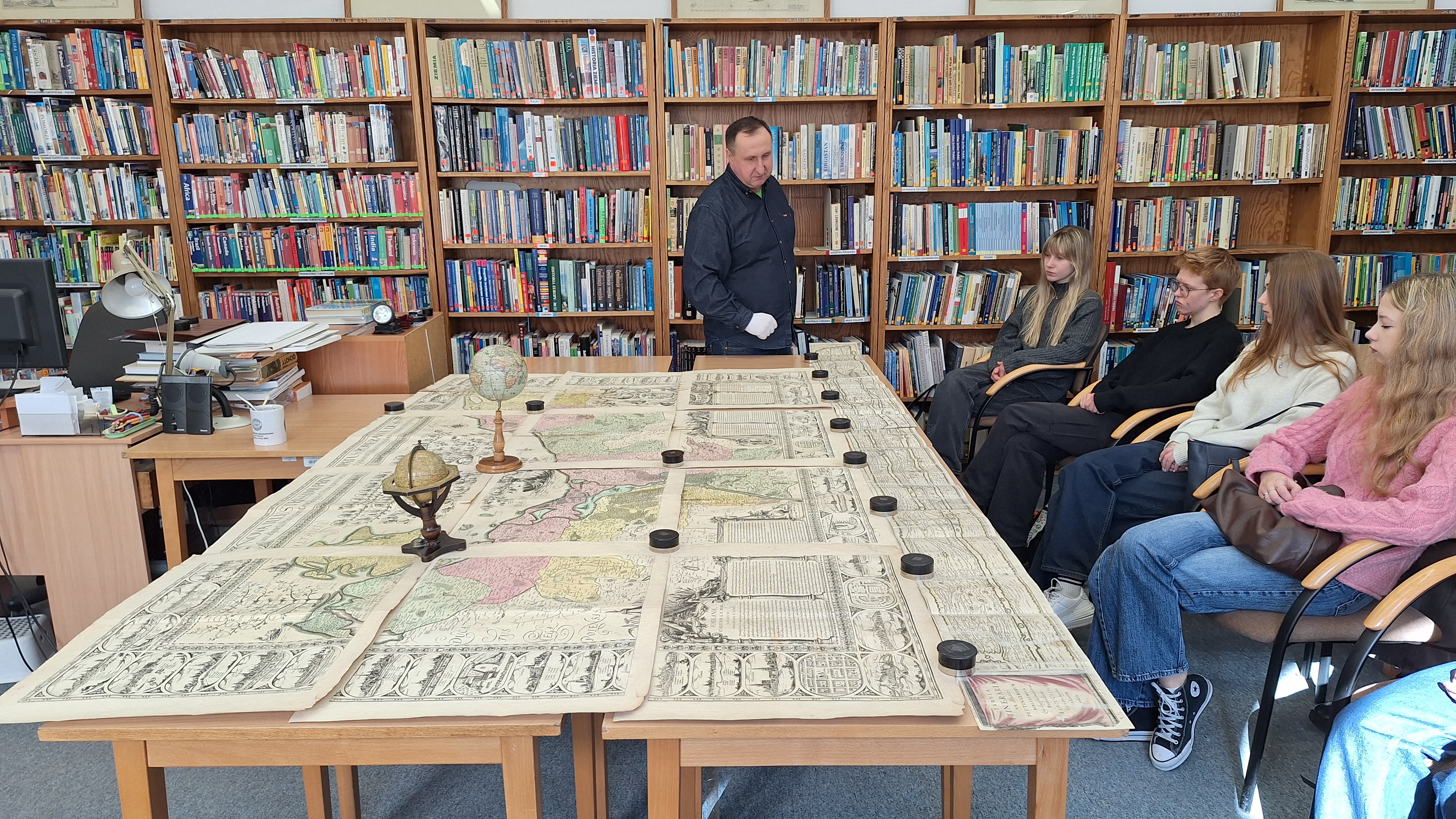 Podczas wizyty uczniowie wzięli udział w trzech różnorodnych zajęciach. Pierwsze z nich odbyły się w bibliotece wydziału, gdzie mieli okazję zobaczyć cenne mapy ze zbiorów Uniwersytetu Warszawskiego, a także pierwszy globus z napisami w języku polskim, pochodzący z połowy XIX wieku.