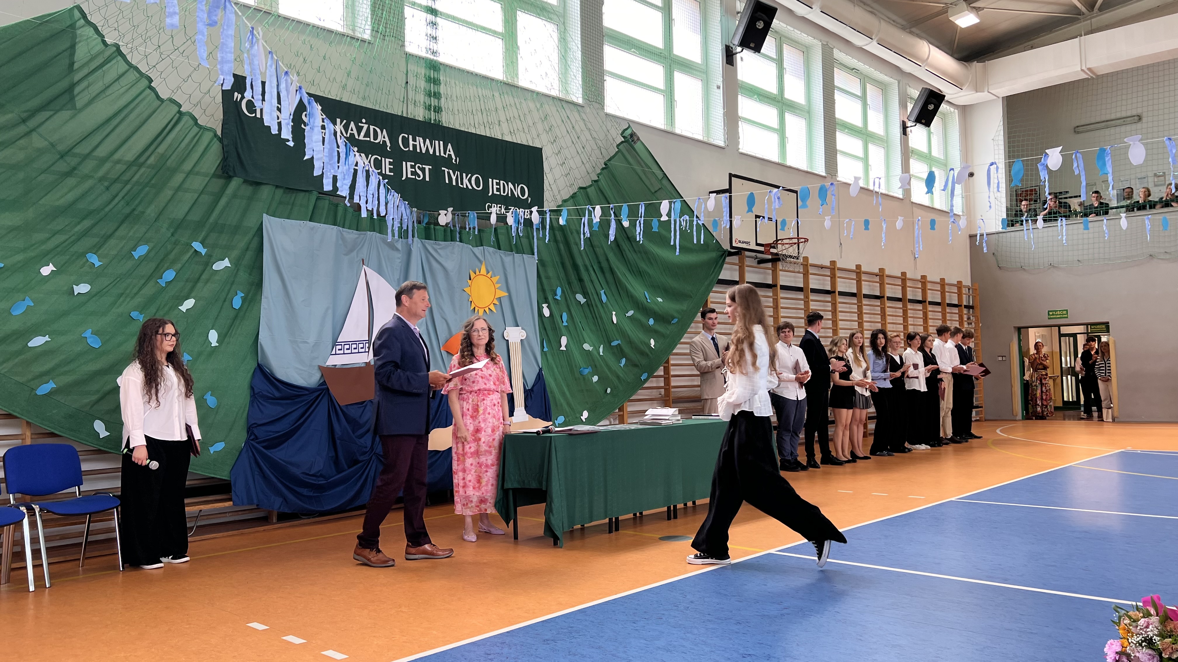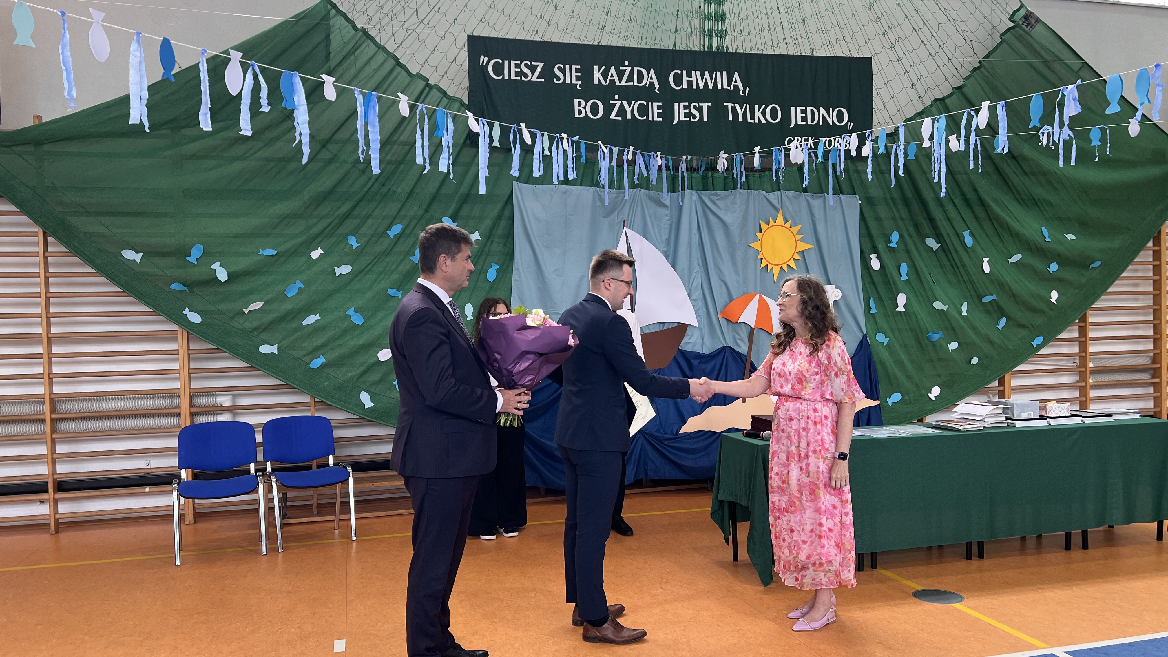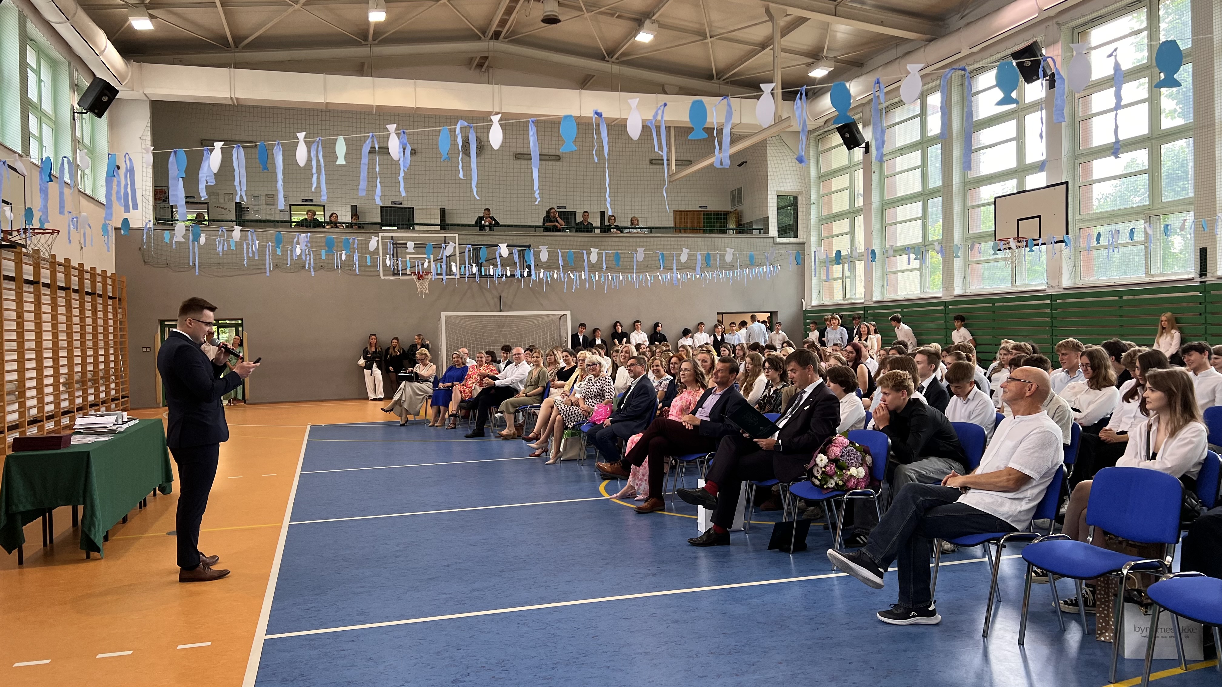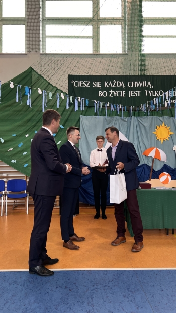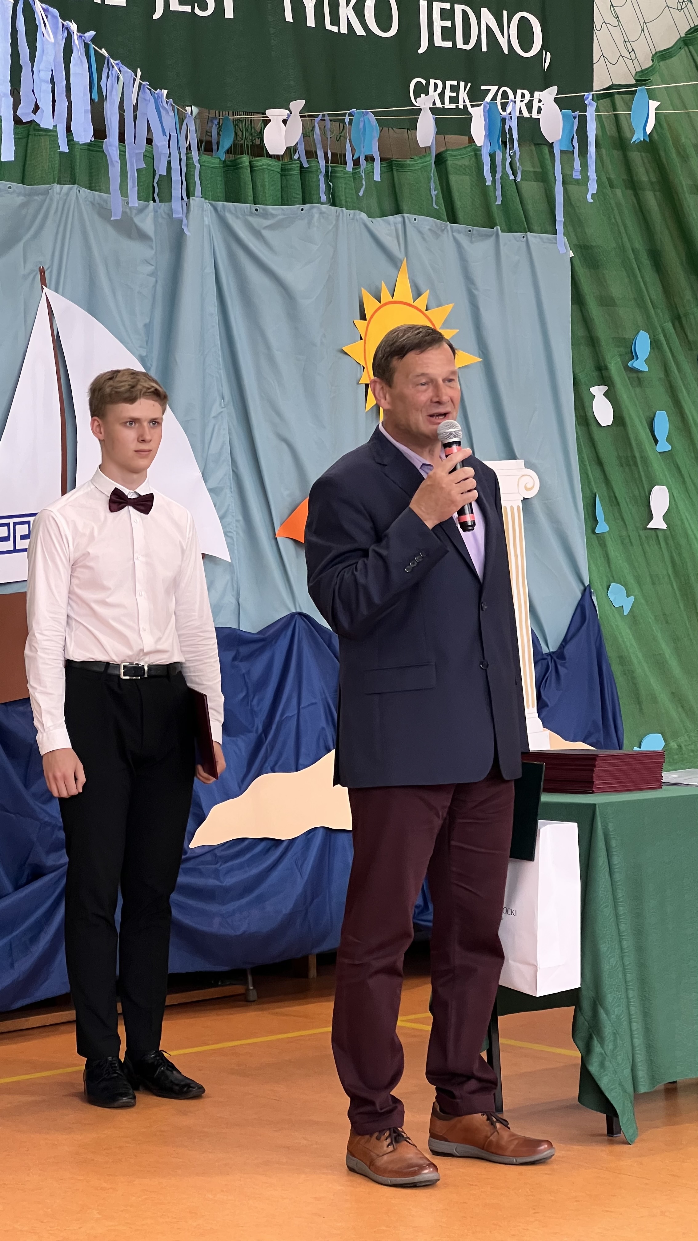 Dziś w naszej szkole miała miejsce uroczystość zakończenia roku szkolnego 2024/2025. W czasie jej trwania przedstawiciele władz powiatowych: Pan starosta Tomasz Laskus i Pan wicestarosta Dariusz Olszewski, rodzice i uczniowie podziękowali za wieloletnią pracę i sukcesy w kierowaniu naszą szkołą dyrektorowi Panu Robertowi Pielakowi, który po 26 latach przestaje pełnić tę funkcję.